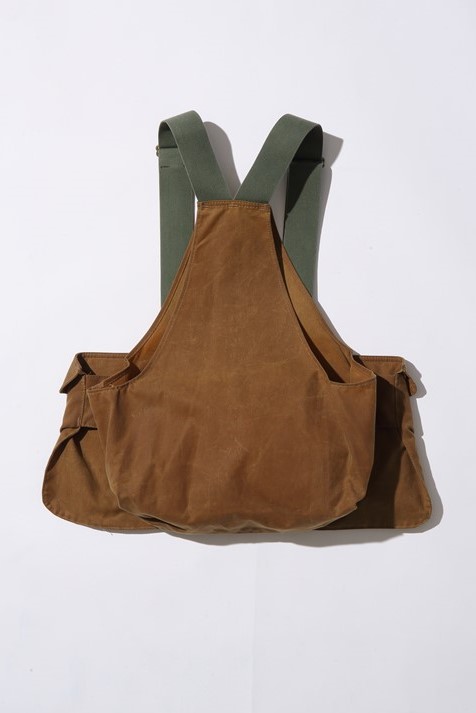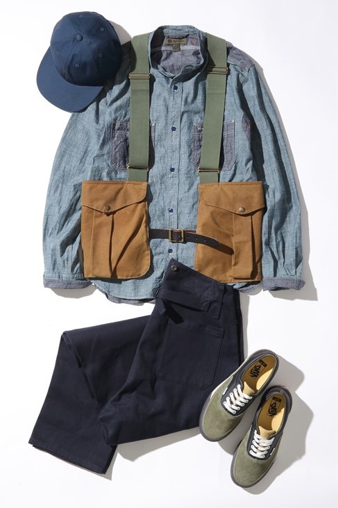 15オンスの厚手なティンクロス・コットンを使い、背面には大きなゲームポケットも装備。オイルフィニッシュで防水性も高いこのハンティングベストは、ちょっと太めなトラウザーをベースに合わせるとバランスが取りやすい。特にこのようにブルーの1トーンを意識したコーデに挿すと全体がまとまる。