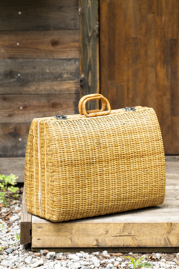 三浦は古着店で見つけたバスケットをお皿やカトラリー用として愛用。専用のものでなくても、用途を変えれば、アウトドア用品にもなる。中はストライプ生地で、映えも狙える。