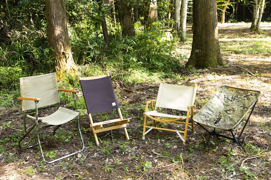 左端はサカサモトのヴィンテージ・ローバーチェア。その横は佐藤の愛用するフィルソンの海外限定チェア。その横も佐藤愛用のカーミットチェア。キャンパー憧れの逸品だ。右端はサカサモトがフリマでも使用する迷彩柄のヘリノックス。すべてコンパクトに収納可能だ。キャンプやBBQでは疲れを考慮しチェアにもこだわりたいもの。急なお誘いに備えて1脚は持っておきたい。