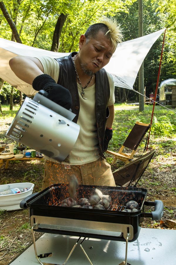 ブーツスタイルを貫く、編集部きってのレザーラバー・モヒカン小川はいつも通りのスタイルでBBQへ。ウェーバーのチムニースターターで炭の火起こし完了! これ、面倒な火起こしが楽にでき、本当におすすめ。そうこうして焼き上がったお肉はというと……
