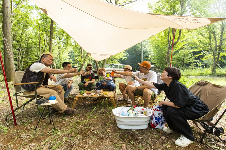 佐藤が愛用するノルディスクのタープ下で乾杯の図。中央に置いたテーブルは、シュペリオールレイバーのセカンドラインで、キャンプ専門のブランド「T.S.L.CUB」の特別なオーク材を使った逸品。さあ、乾杯!