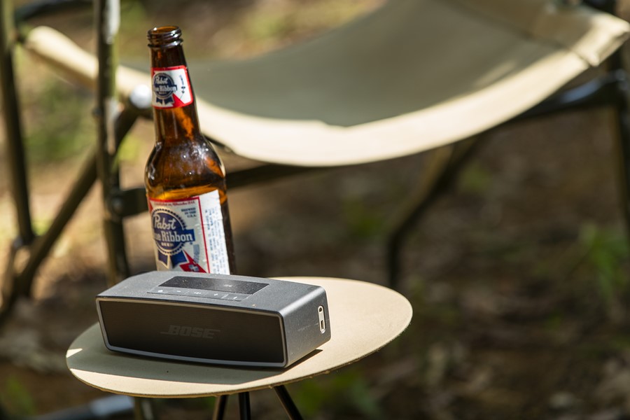 佐藤愛用のヘリノックス×ネイバーフッドのテーブルは普段はインテリアと使いつつ、キャンプやBBQには折り畳んで出動。そのうえに置いた三浦愛用のボーズ「サウンドリンクMini II」も、室内っで普段使っているものをそのまま外に持ち出せるコンパクトさがいい!