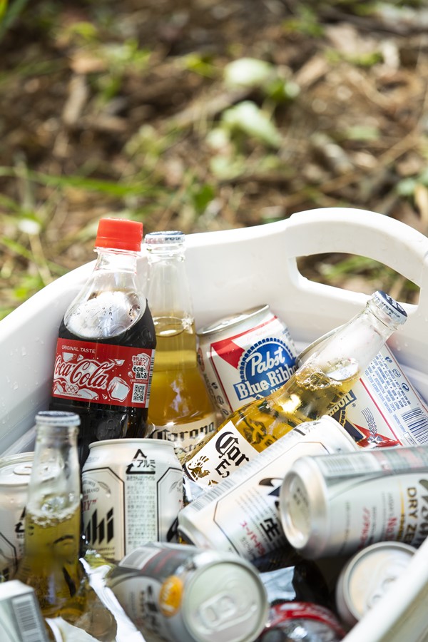 アメカジ生まれの人気ビール「パブストブルーリボン」をはじめ、コロナやスーパードライの他、ソフトドリンクも多数用意。これまた、以前記事にした、伊勢藤のソフトタブに入れた氷水に浸かる様は、クーラーボックスよりなんかいい。