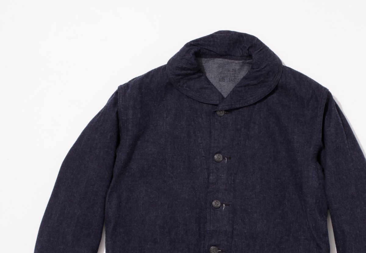 こちらも同じく第二次世界大戦時に、アメリカ海軍の兵士が甲板作業などで着用したデニムユーティリティジャケット。海軍ならではのショールカラーがポイントで、デニムの色落ちも楽しめる。
