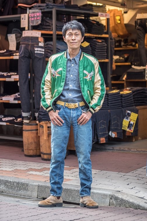 スカジャンにシャツを合わせれば、大人スカジャンコーデに。