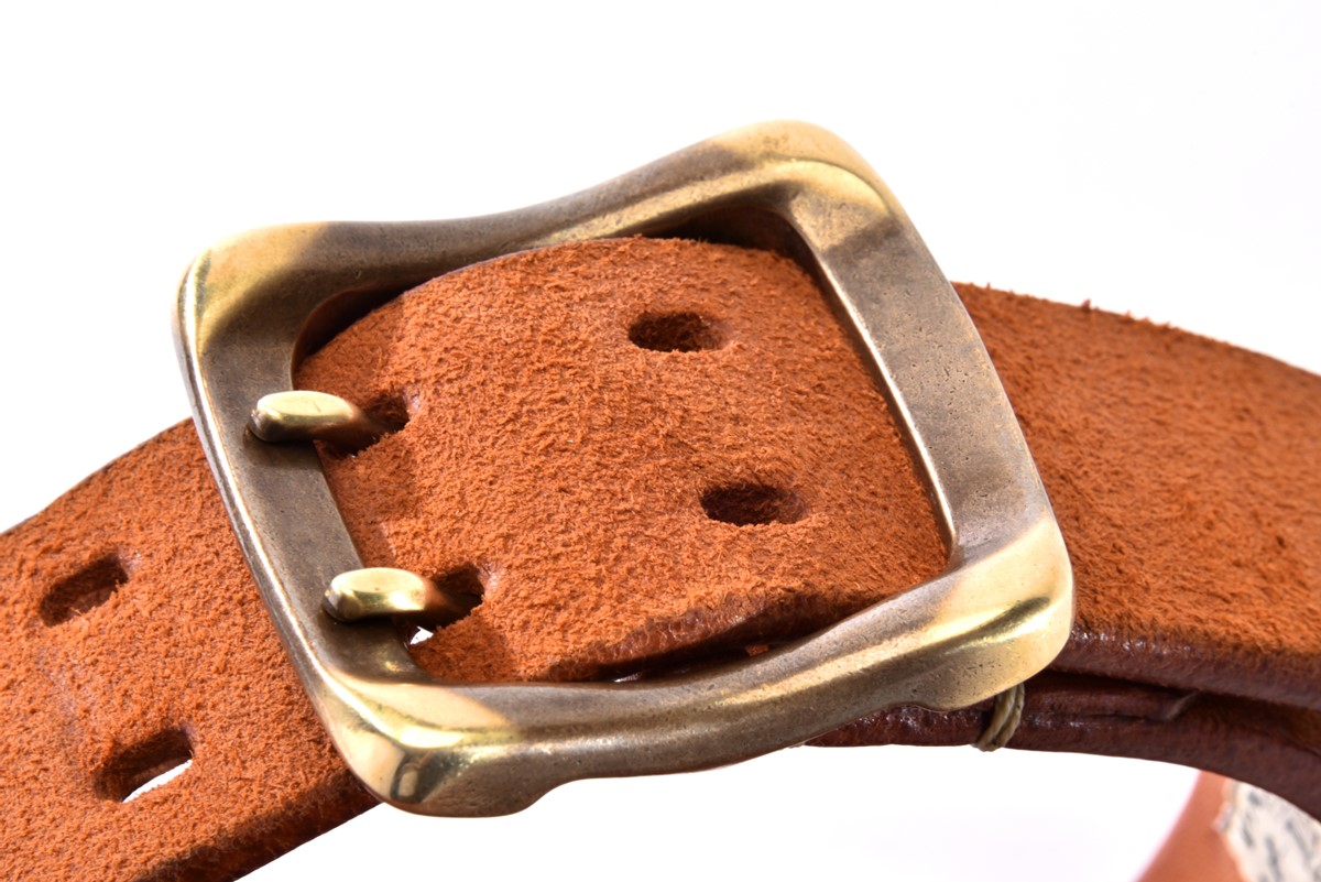 きれいなライトブラウンのスウェードの質感と、男っぽいダブルピンという両極端な雰囲気が同居しているのが、個人的なお気に入りポイント。やや湾曲したブラスバックルは、経年変化により、真鍮がくすむ部分と輝く部分のコントラストを楽しみたい。色落ちしたデニムにも抜群に似合うので、これからの秋が楽しみで、使い込んだらどんな雰囲気になるのかも期待が膨らむ。