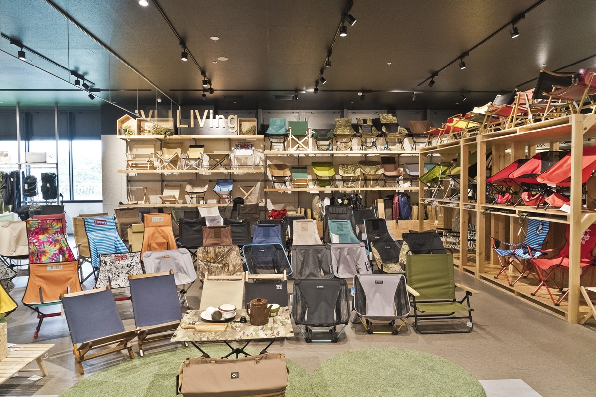 チェアのコーナーもこの通り。写真に入りきらないほどのモデルが所狭しと並んでいる。全て試し座りもできる上に、実際に畳んでみることも可能だ。