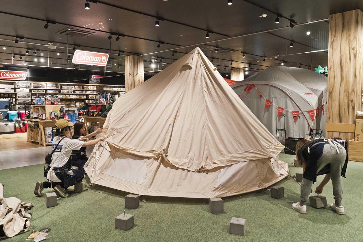 先にも述べたように、このお店の大きな特徴のひとつが、このように専門のスタッフがテントの“試し張り” をしてくれること。サイズ感や工程が確認できるのだ。ちなみにこのテントはノルディスクのアスガルド。