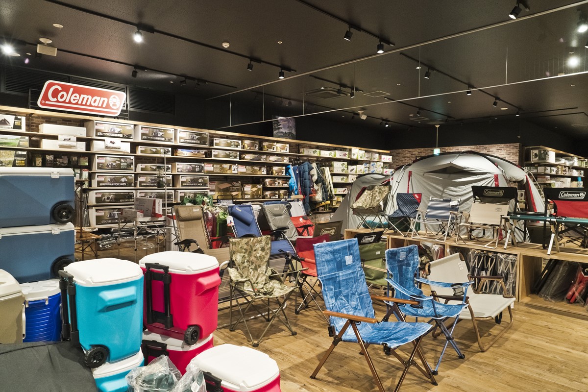 コールマンの一角。いま買えるモノは全てあるのではないかと思うほど、バリエーション豊富。このようなコーナーを、ロゴスやスノーピークも展開する。