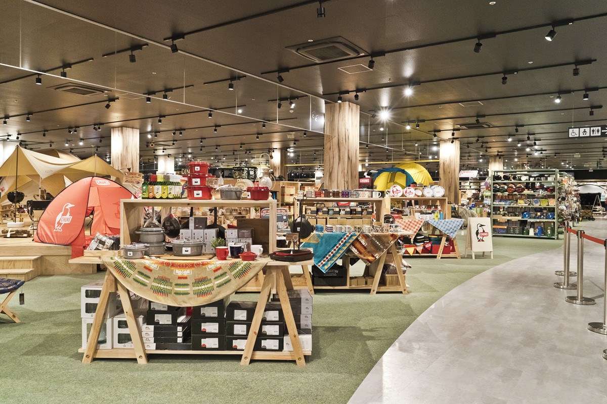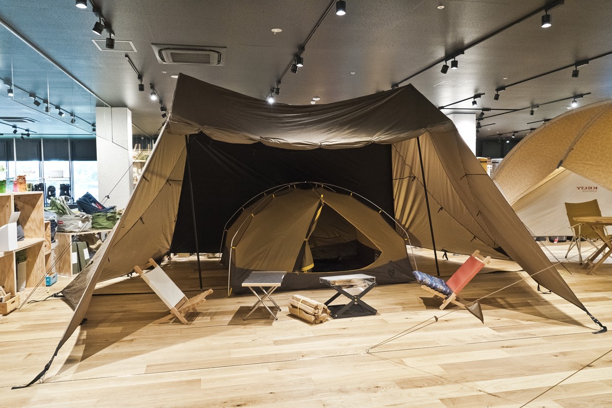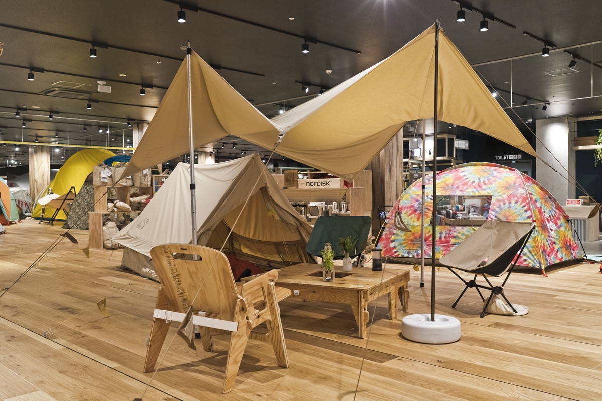1階は、いま大人気のキャンプ関連のアウトドア用品フロアになっており、日常的に使える調理用具やステンレスボトルから、本格的なテントまで何でも揃っている。フロア中央にあるウッドデッキには様々なテントが張られており、2週に1回のペースでその時期にあったスタイルを提案。気になるテントを“試し張り”できる専用スペースも用意されている。