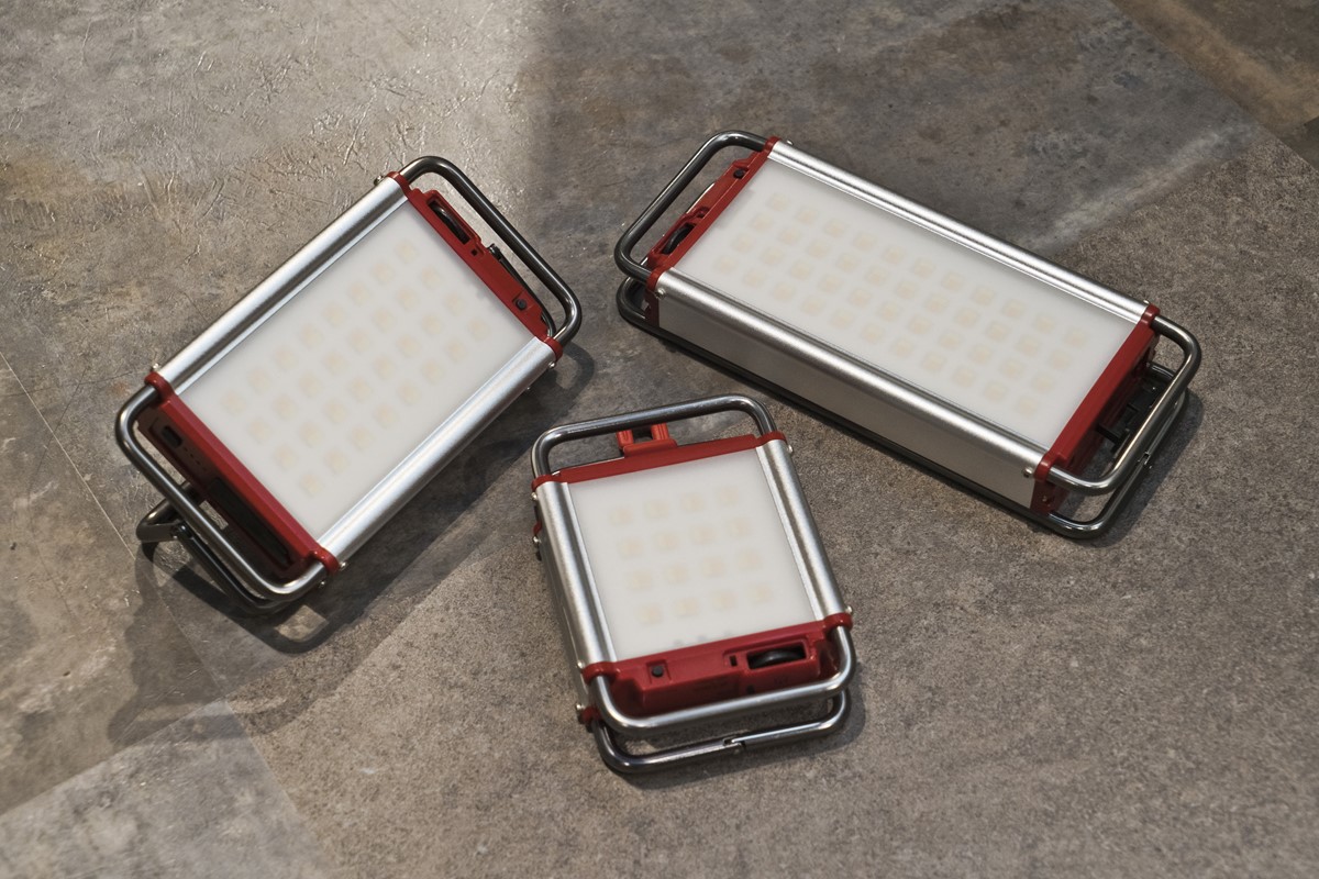 コンパクトで明るく人気のクレイモアの充電式マルチLEDランタンも2階で発見。色合いや明るさの調整が可能だ。S / 8618 円、M / 1万778円、L / 1万2938円と3サイズ展開