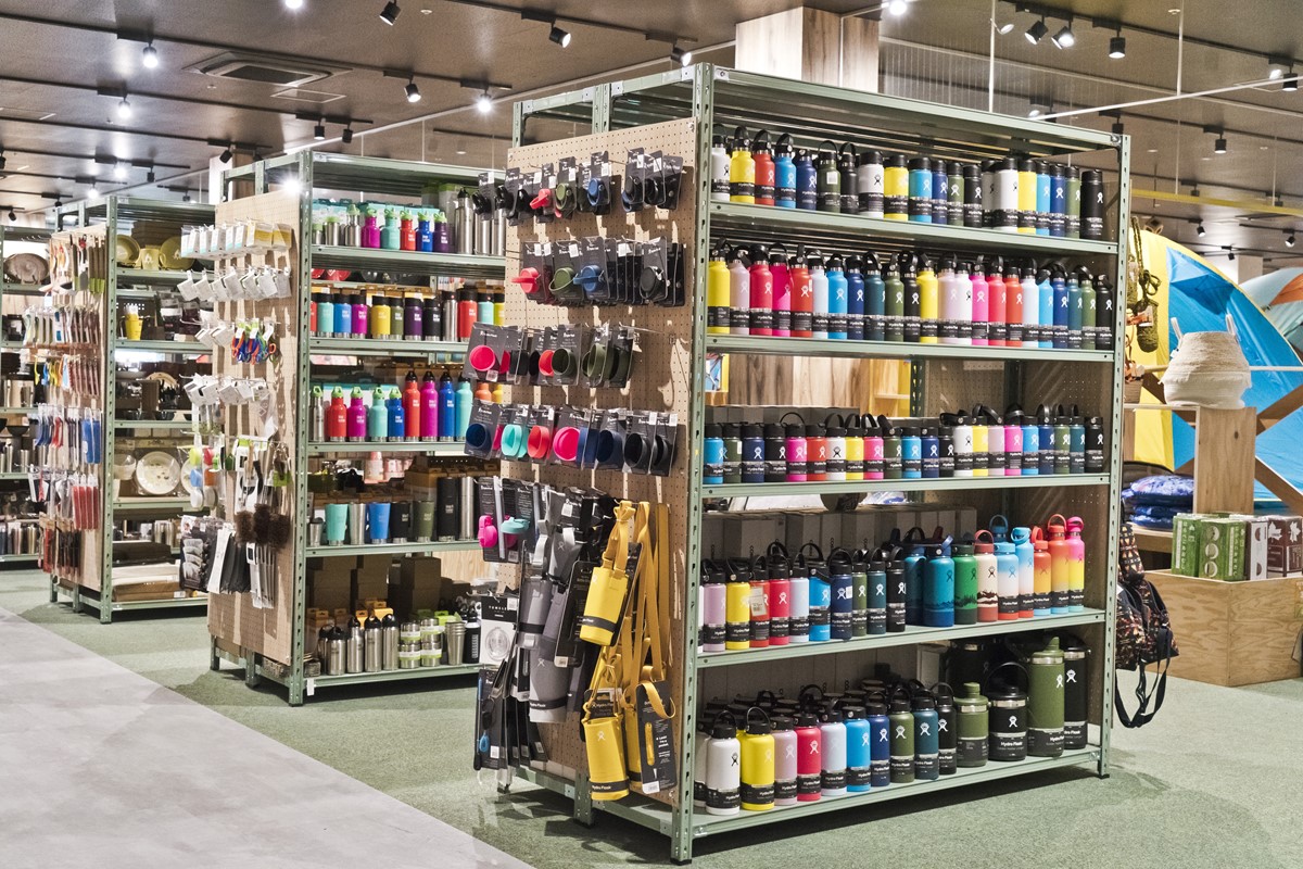 水筒コーナーも膨大な数のボトルが並ぶ。アメリカ・オレゴン州生まれのオシャレな水筒、ハイドロフラスクはレアな大きなサイズまでラインナップ。
