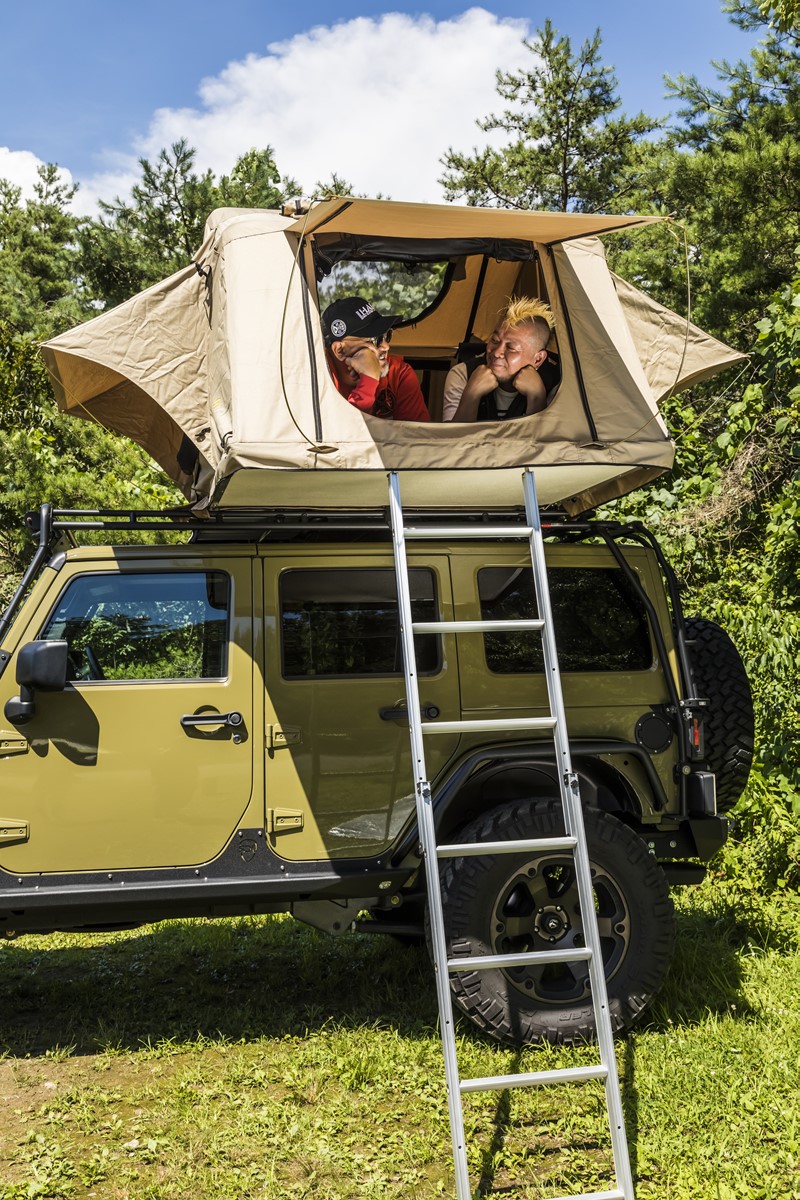 下地兄ィもモヒカン小川も、今回初めての体験となる「ルーフテント」。4WDのカスタムで定評のあるテックフォーのデモカー、’12年式ジープ・ラングラー・アンリミテッド・サハラに装備されたルーフテントは、造りもしっかりしていて快適!(TECH FOUR TEL0465-49-1449)