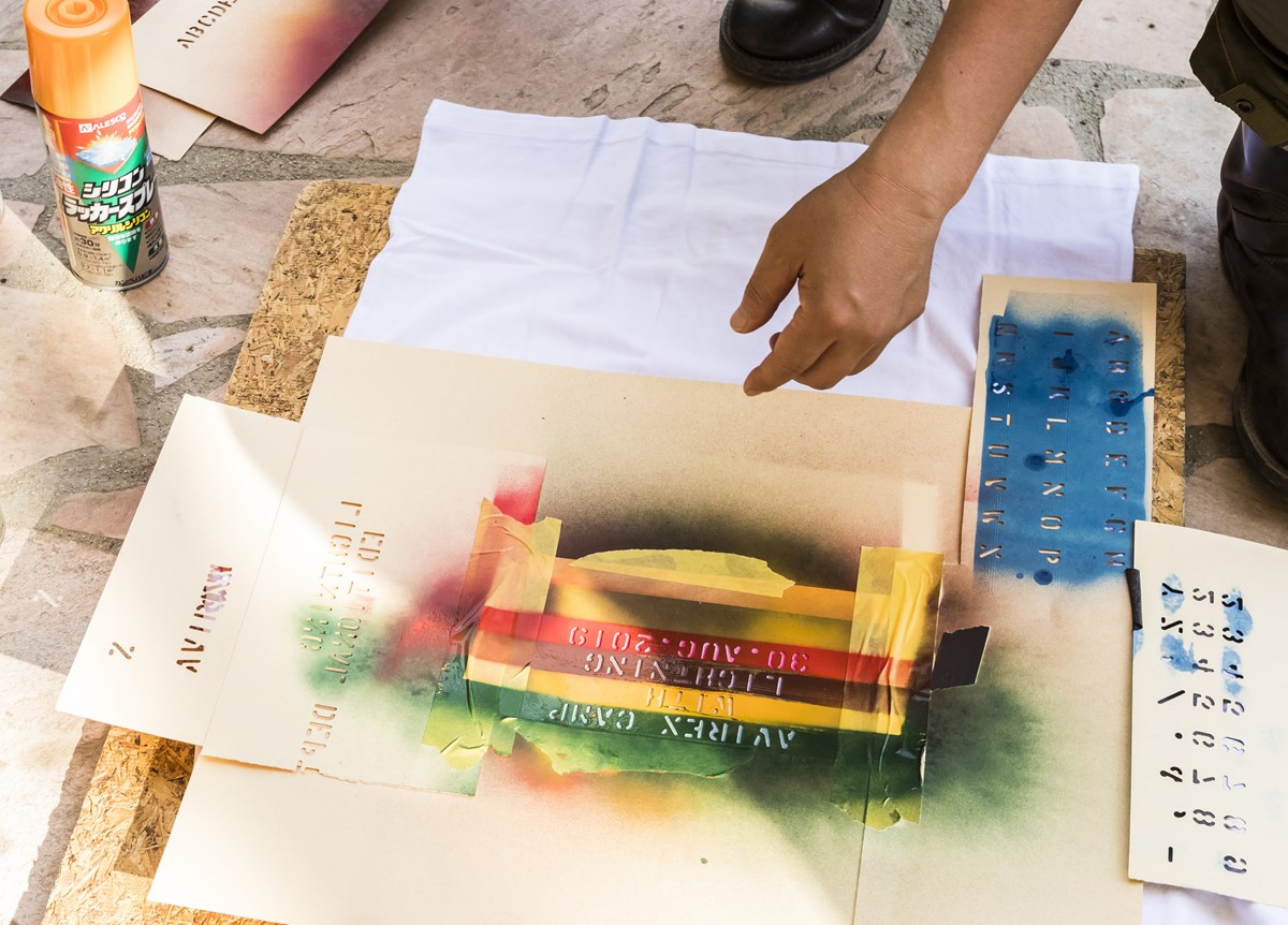 ステンシルは、ミリタリーカスタムの基本のキ。今回は米軍実物ステンシルマシンを持ちこんで、Tシャツにステンシルカスタムを楽しむことに。こんな楽しみ方もミリタリーキャンプならでは。
