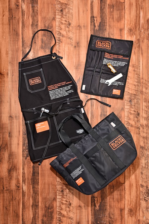 まず意外だったのが、アメリカの工具ブランド「ブラック・アンド・デッカー」と、ニコアンドが展開する「オールドスミス ハードウエア」がコラボしたこと。ブラック・アンド・デッカーのブランドカラーを基調に、エプロン、ツールボックス、メジャー、ポーチ(2種類)、ツールバッグ、トートバッグ、iPhone7/8対応のケース、電源タップ、キーリングの10点が登場し、ニコアンドらしい機能性の高さを兼ね備えている。電源タップやポーチなど普段使いできるものもあるので、普段DIYをしない人にもおすすめだ。ブラック×オレンジという男女問わず使いやすいカラーリングもいい。