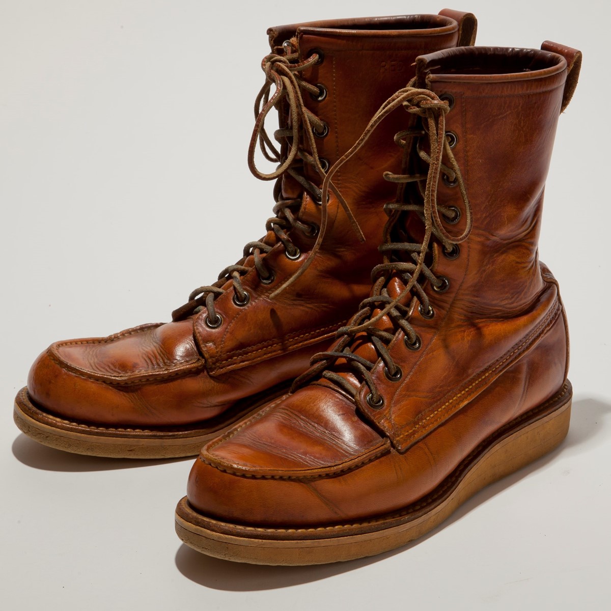 当時カリフォルニアのタンナーで開発された、美しいオレンジがかった茶色のフルグレインレザーの独占使用権を得たレッドウィングは、そのレザーで8インチ丈のハンティングブーツをつくった。モカシンタイプのつま先や、靴の側面下部に縫い目が入らないオールアラウンドバンプ、そして当時ハンターたちに人気のあったグロコード「キングB」ソールを組み合わせたこのハンティングブーツのベロ裏には、ハンターの姿をあしらったグリーンのタグが縫い付けられていた。