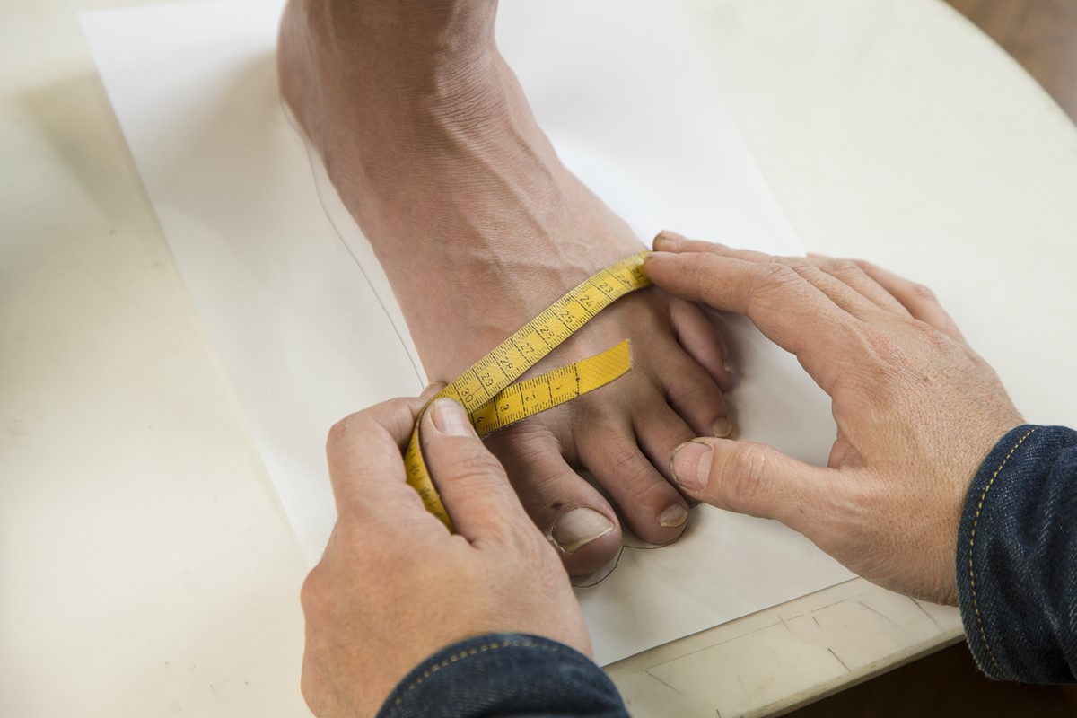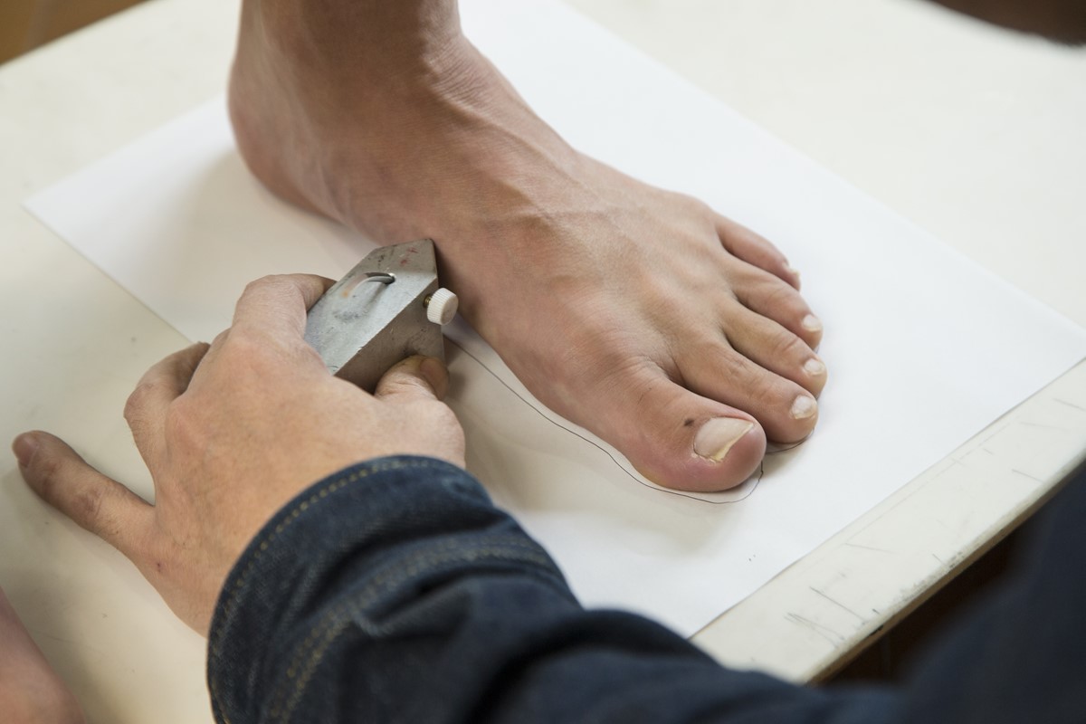 上から見た足のフォルム「外格」を測る。写真ではスクライバーという専用の器具を使っているが、鉛筆を立てるようにすれば器具を使わなくても測ることができる。この外周のかかと~つま先が「足長」となる。