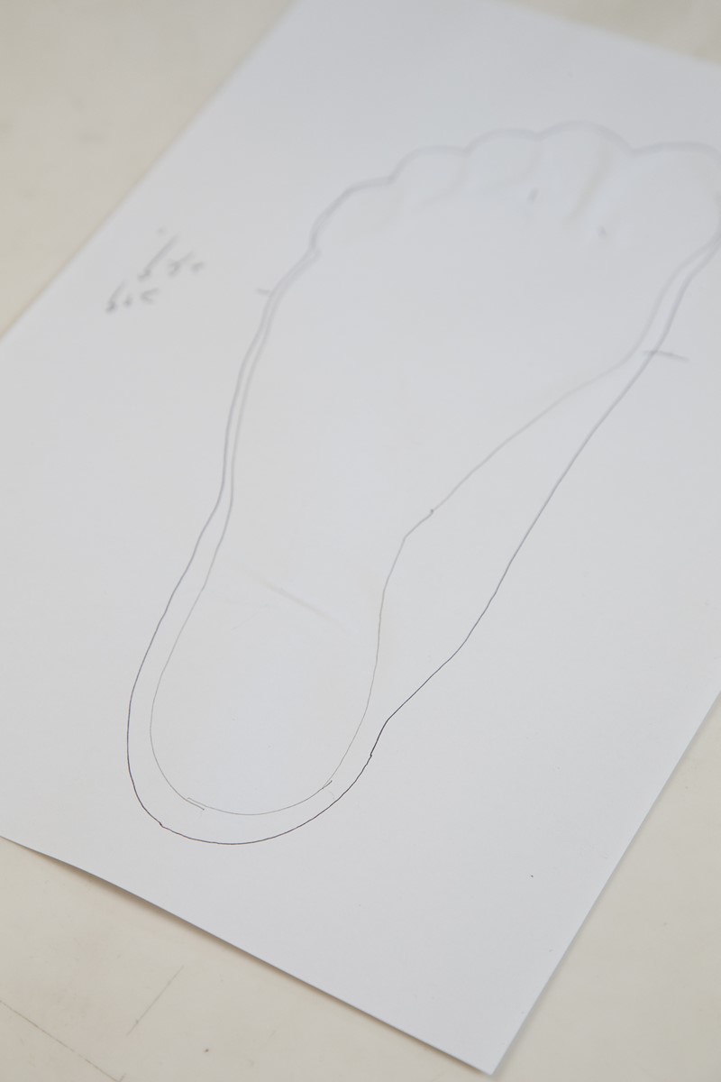 続いて鉛筆の先を斜めにして、足と地面の接地面をなぞるようにして「内格」を測る。土踏まずやかかとなど、上から見た外周と、実際に接地している内周の差を見ることで足の特徴などがわかってくる。