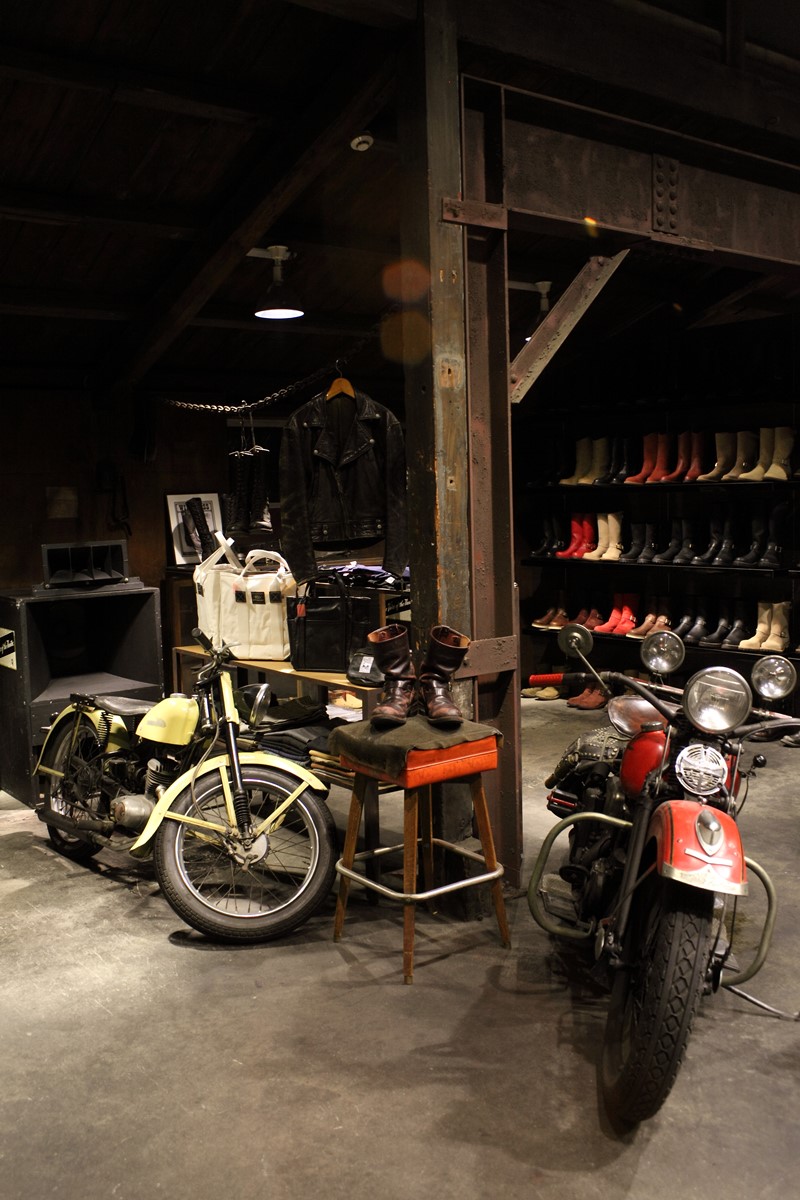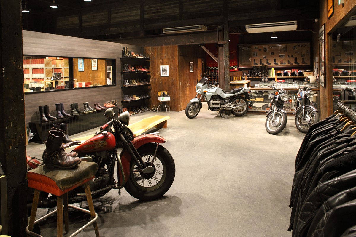 ウエスコはロガーブーツが全盛だった’40年代以前から、モーターサイクルの世界にも徐々に浸透していった。ウエスコジャパンの店内には、旧いモーターサイクルやレザージャケットも並び、そんな当時のウエスコを取り巻くモーターサイクルカルチャーを垣間見ることができる。