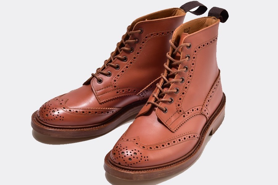 写真は、トリッカーズを象徴するモデルにしてカントリーブーツの傑作「MALTON」。雨が多い英国の気象を考慮して防水性に優れたカーフレザーのアッパー素材、内部へ水が染み込むのを防ぐためのストームウェルト、足への衝撃を吸収するダブルレザーソールなど、デザインだけでなく機能的にも名作と呼ぶに相応しい完成度。チャールズ国王がルームシューズを愛用していたことからロイヤルワラント(英国王室御用達)の証を授かった。
