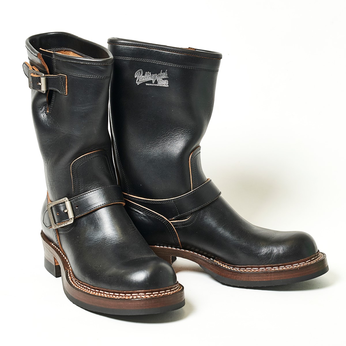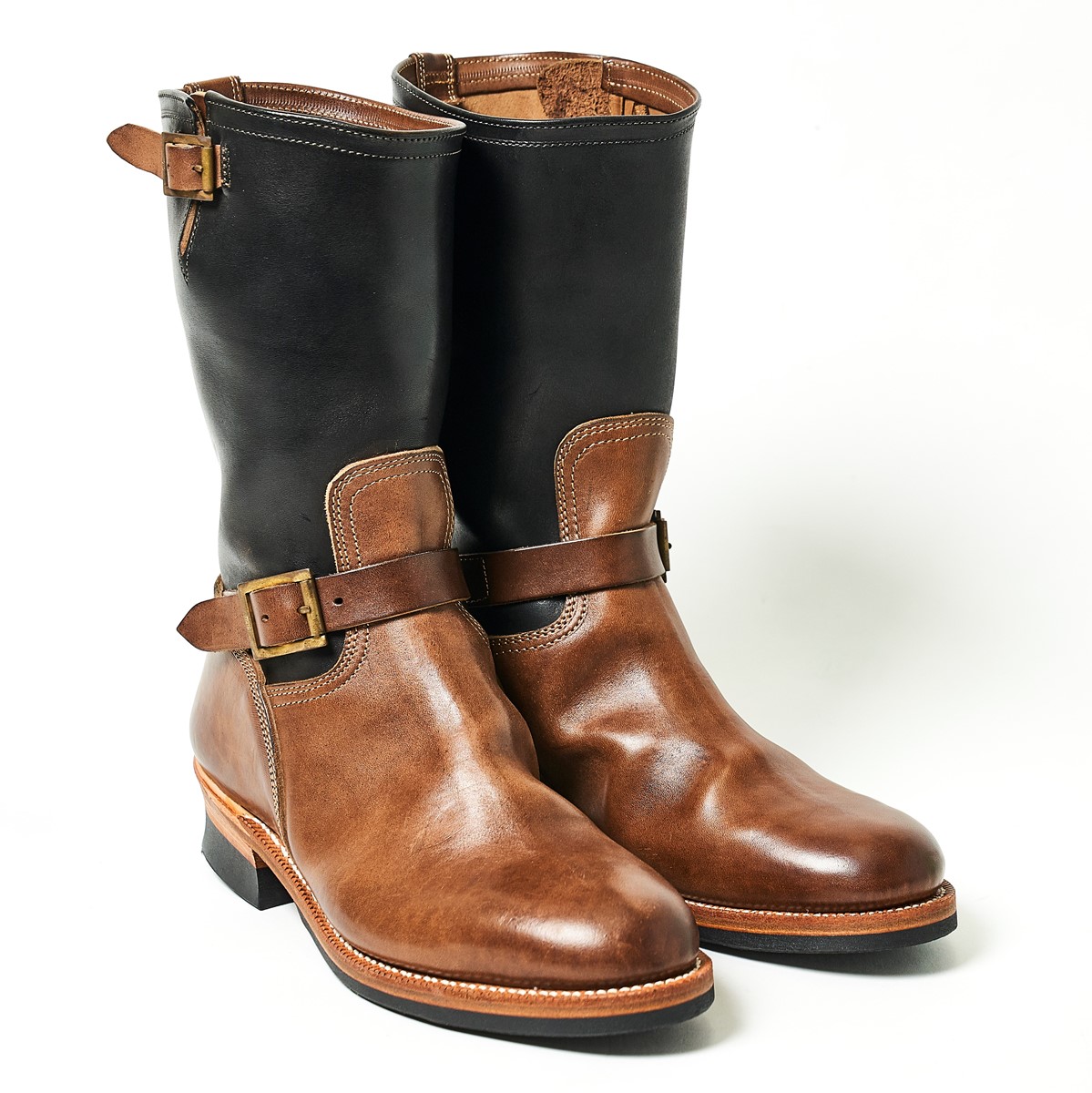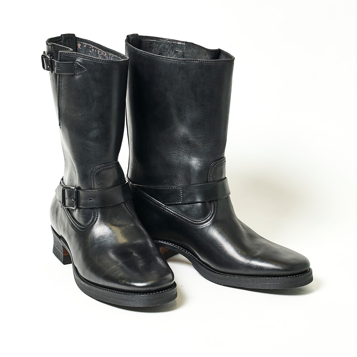 写真は表面を黒塗りした茶芯が穿き込むほどに表情を増す、ベジタブルタンニン鞣しのホースハイドを使用したロングステムエンジニア。アウトソールにはキャッツポウ、足の甲部分に見られるクリンピングと呼ばれる鼻筋を思わせるラインも忠実に再現し、バックルは特注により鉄製でリプロダクトしている。