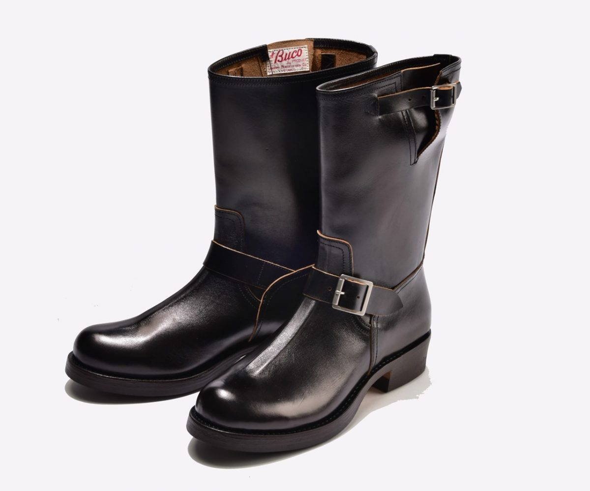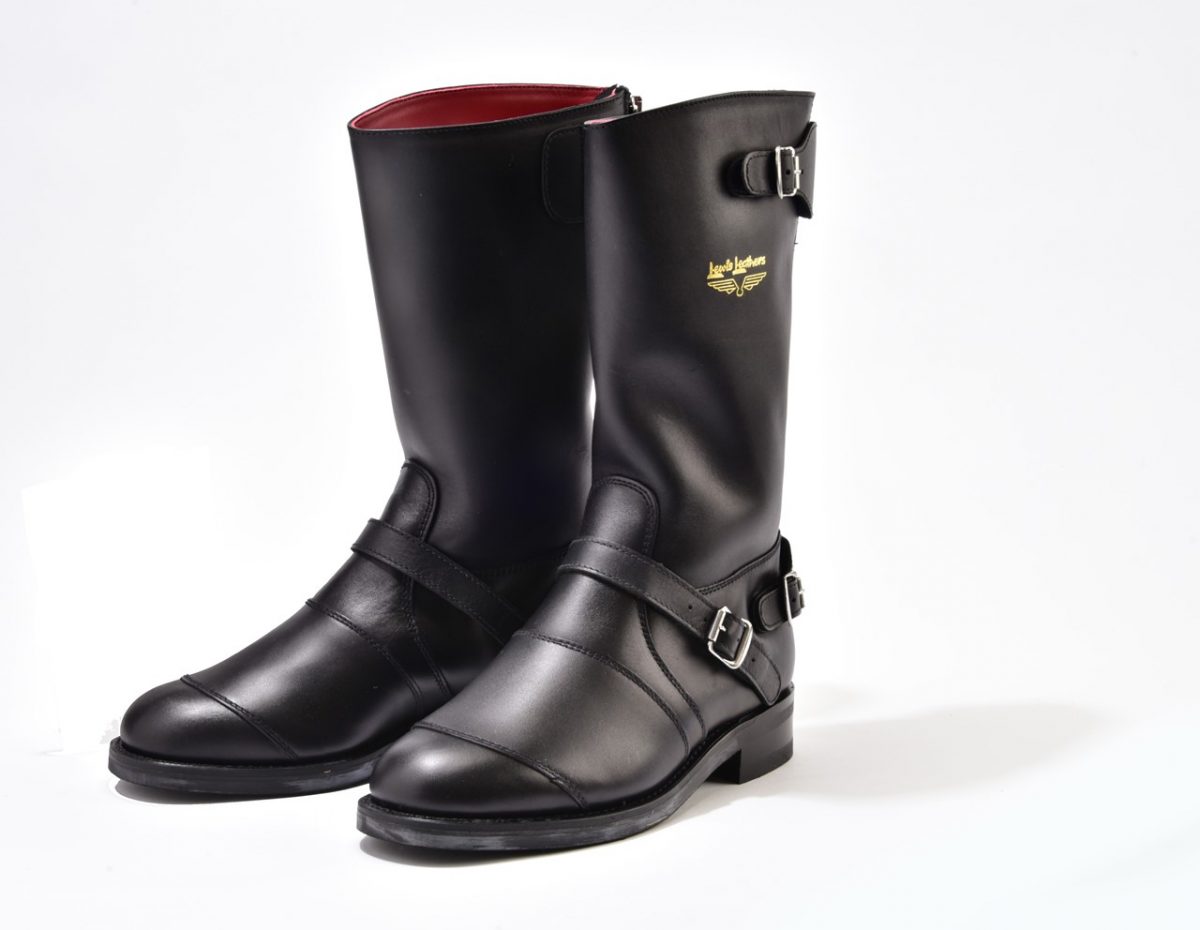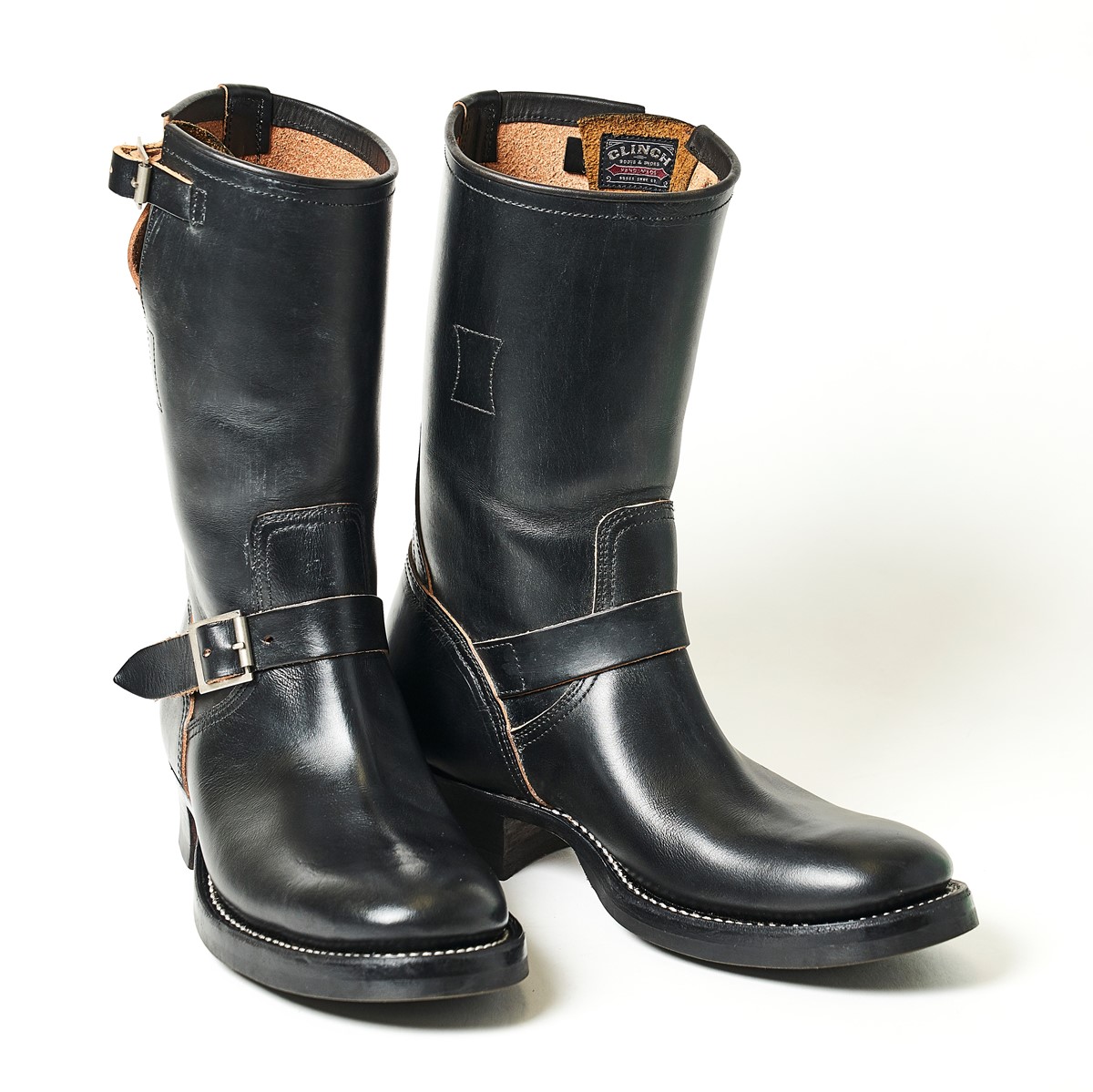 写真は表面を黒塗りした茶芯が穿き込むほどに表情を増す、ベジタブルタンニン鞣しのホースハイドを使用したロングステムエンジニア。アウトソールにはキャッツポウ、足の甲部分に見られるクリンピングと呼ばれる鼻筋を思わせるラインも忠実に再現し、バックルは特注により鉄製でリプロダクトしている。