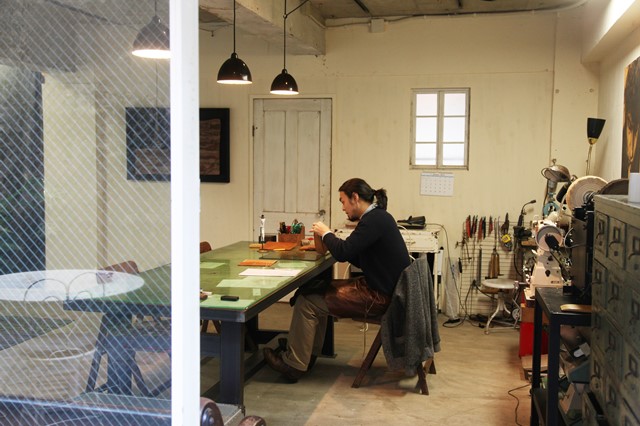 ショップに隣接している作業場から、多くの商品が誕生した。ちなみにラインナップにナチュラルカラーの革を使用したものが多いというのは、最終的にそのものを使い込み、アジを出して完成形へと仕上げる作業をお客様に委ねているというメッセージなのだそう。