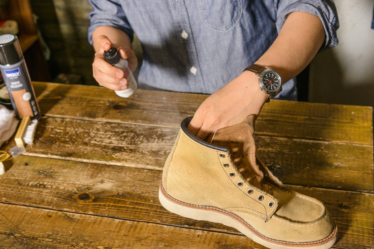 しかし、現在ワークブーツとは言っても、ファッション性を求めることで、水に弱い素材を使用したいるものも増えている。さらに、雨に降られたあと放置すると、カビが発生したり、劣化したりと、ダメージを受けることもあるので、メンテナンスは必須と言える。ワークブーツで一般的な水に強いとされるオイルドレザーであっても、防水性があるわけではないので、プロテクトスプレーを施したほうがいいだろう。