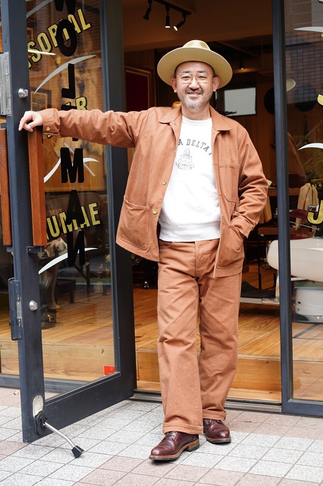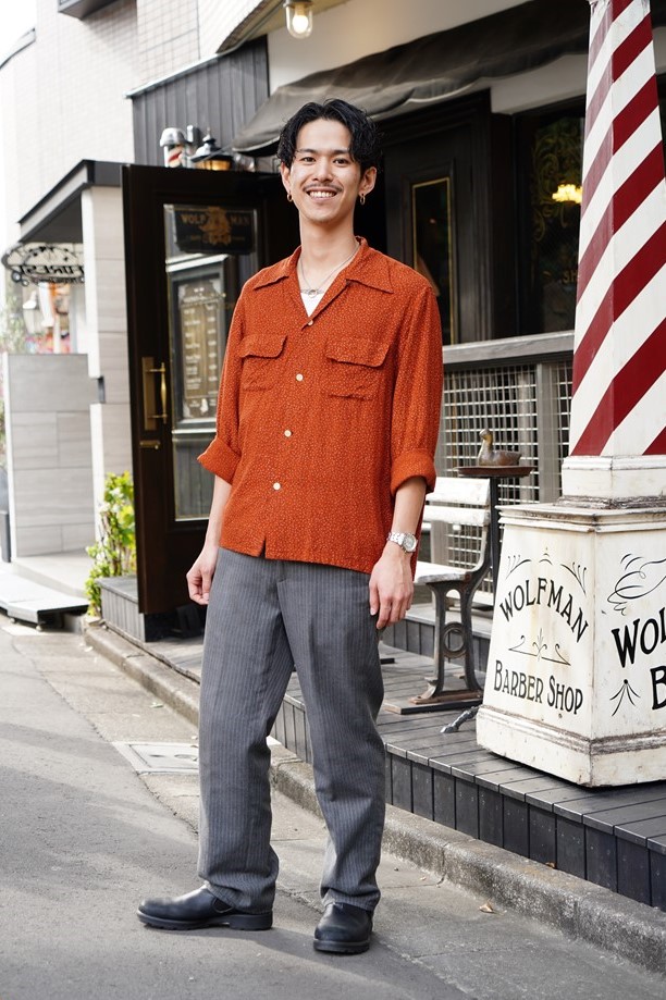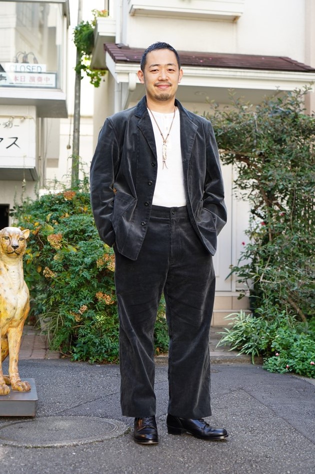 神宮前に新店舗をオープンしたばかりのウルフマンバーバーショップの曽原さんは、グラッド ハンドのオールアメリカンブーツを愛用している。グルーヴィンハイのセットアップはブラウンダックで、全体をアースカラーでまとめたカラーリング術にも注目したい。