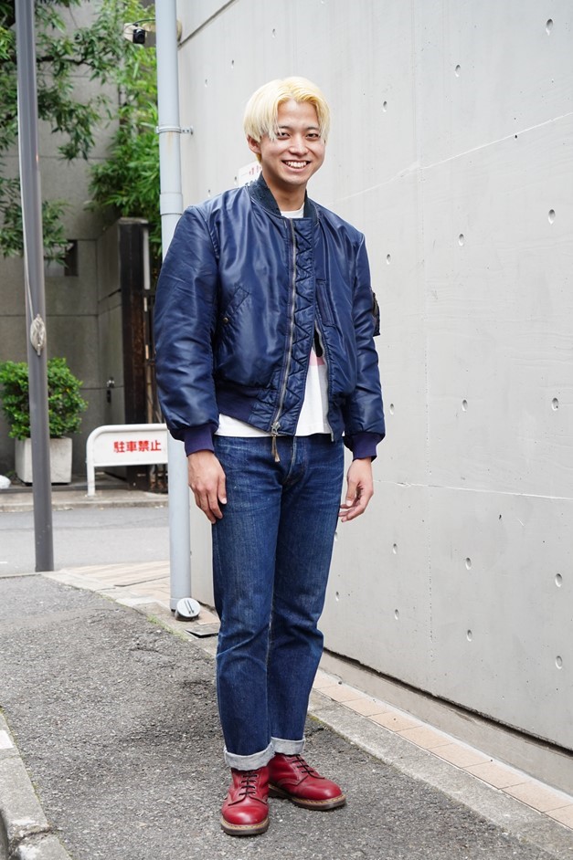 名店ベルベルジンの若手スタッフである朝日さんは、UK的なカルチャーを感じさせるスタリングが好印象。通なヴィンテージのB15C MODをメインにして、足元にはアクセントとなる赤のドクターマーチンをセレクト。シド・ヴィシャスも愛用していた10ホールを履く。