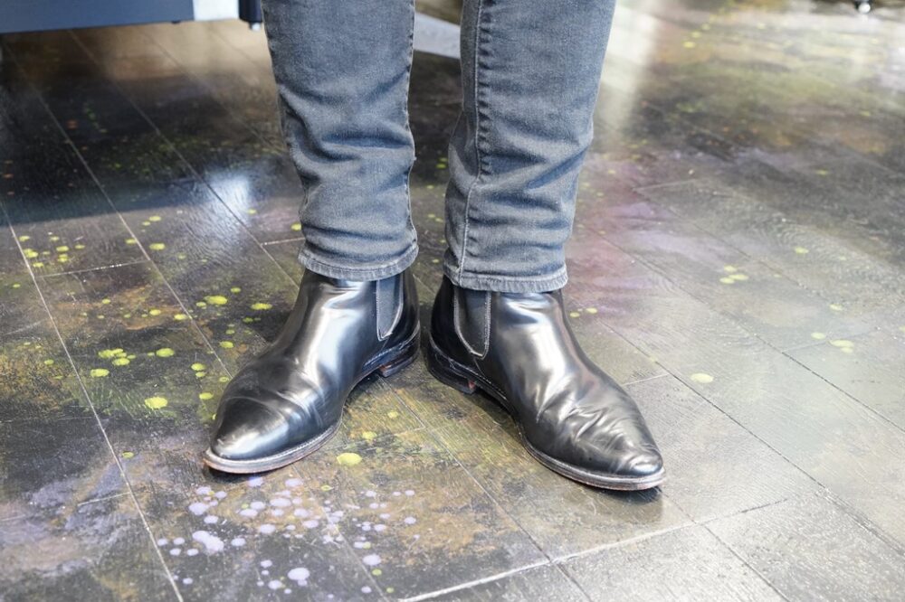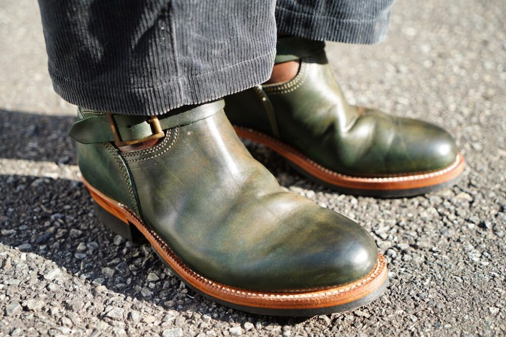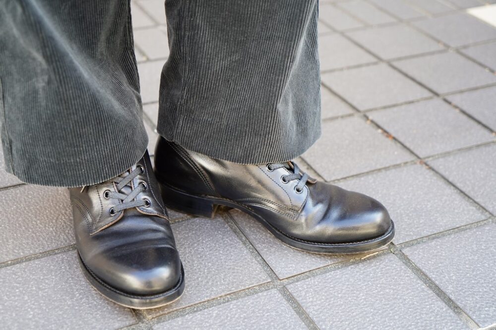 無骨なスタイルが板についているショップスタッフの福島さんは、イタリアンホースフロントを使ったモーターのサービスブーツを着用していた。ホースハイドならではの光沢感と細身のラストがマッチしており、コーデュロイのセットアップと見事に調和していた。