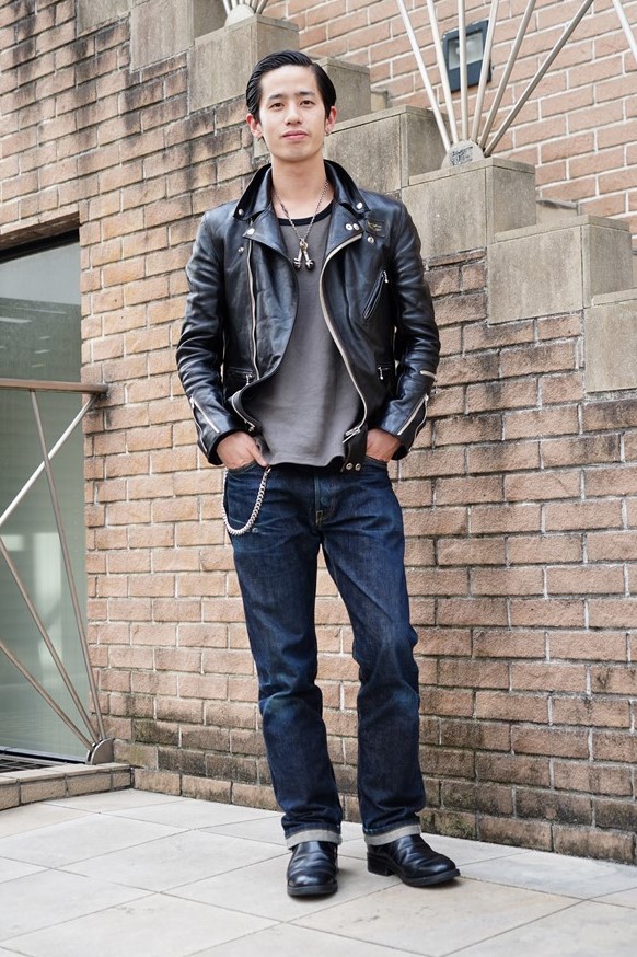 ルイスレザーズのフラッグシップストアのスタッフを務める安田さんは、いいエイジングをした同社のライダースジャケットに、ベルト使いが際立つ人気のモーターウェイブーツを着用。本格的なライディングブーツでありながらも、デイリーユースしている好例だ。