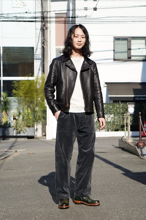 この日はツーリング帰りだった名物スタッフの澤田さんをピックアップ。そのためヴィンテージのライダースジャケットとレザーパンツを合わせ、足元は現行のルイスレザーズのモーターウェイブーツでスタイリング。ブーツインすることで、より硬派な印象に。