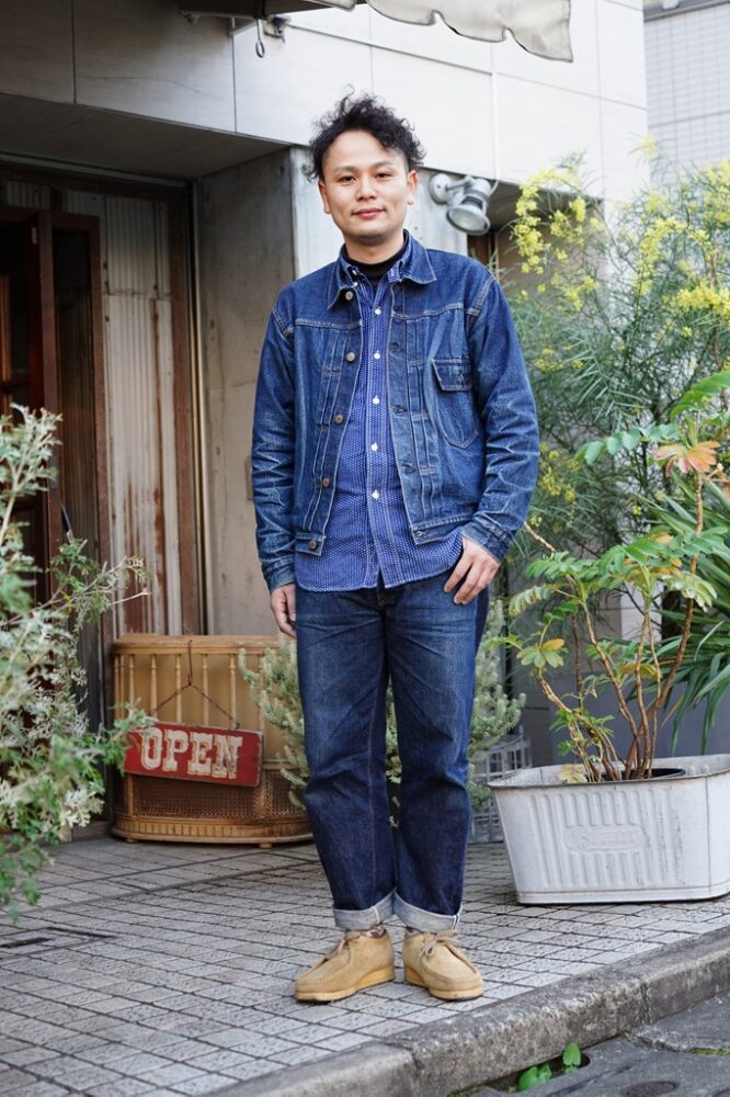 ウエアハウスがWW2時代のデッドストックデニムを再現したオリジナルデニムのセットアップで登場した田邊さん。足元はトレンドになっている名作ワラビーをセレクト。さり気ないアクセントになったカモフラ柄のソックスはロトト。ジャケットは1年弱でこの色落ちだという。