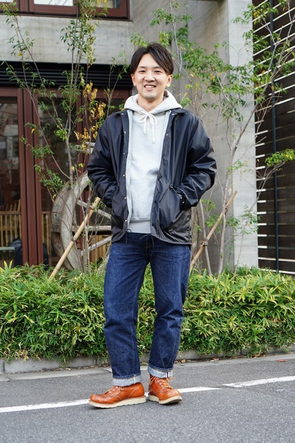 ウエアハウス東京店の名物店長である浅井さんは、レッドウィングの定番ブーツを使った王道アメカジコーデ。よく見るとわかるように、スクエアステッチの補強が入ったヴィンテージで、製造年と月が自身の誕生日とまったく同じというから驚き。このこだわりは見習いたいものだ。