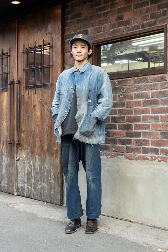ブラスのクラフトマンである上林さんの見どころは、ワークとカジュアルの絶妙な組み合わせ。シンプルながらも存在感のあるブーツはクリンチのイエガーブーツ。ホースハイドを使った上品な雰囲気に、あえてエイジングされたヴィンテージのカバーオールやBBキャップを選択。
