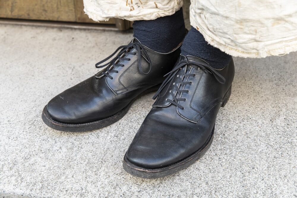 ブラスでアルチザンとして務める古賀さんは、オリジナルブランドであるクリンチのサービスシューズを着用。ミリタリーで実際に使われていたラストをベースにした独自の木型は履きやすく、シャープな印象もあるので、どんなコーディネイトにもマッチしてくれるのが心強い。