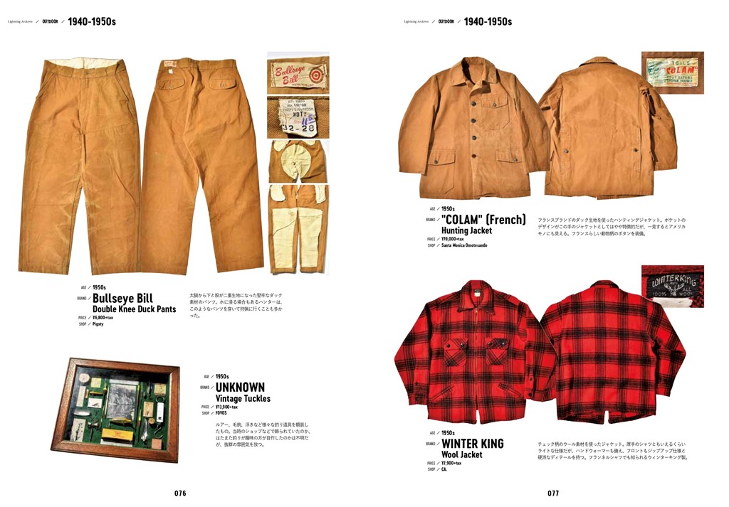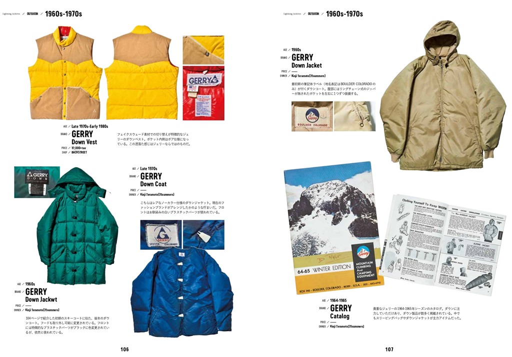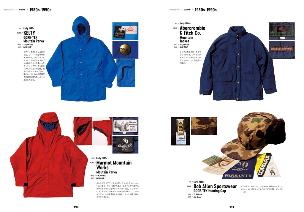 掲載アイテムは、ジャケットのほかキャップ、ブーツ、釣り道具、ブランドカタログなども含め、その数なんと400点以上。それに加えて、パタゴニアやノースフェイスといったお馴染みのアウトドアブランドから、なかなかお目にかかれない幻のブランド、今ではアウトドアの面影もないあの人気ブランドまで、様々なブランドの背景を探ることもできちゃうのだ!