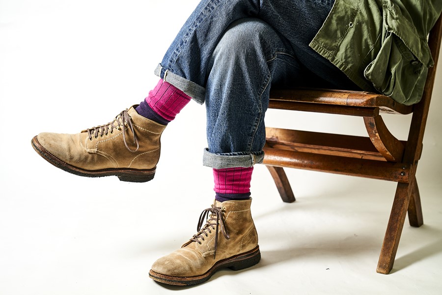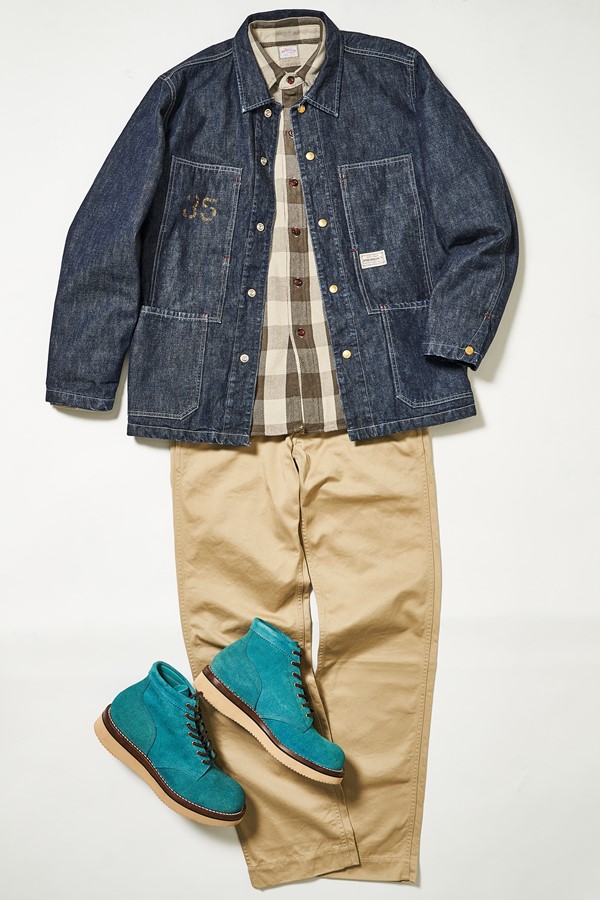 こちらも珍しいターコイズブルーのレースアップ。右のように色合わせをして着こなしに馴染ませるのも有効だが、鮮やかな色合いのブーツは派手になる可能性もあるため、あえて強調させてコーディネイトのアクセントにするという手もアリ。そのために服はパンチのあるアイテムは避け、オーソドックスなアイテムを選ぶのがポイント。