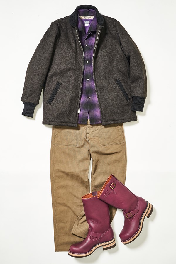 珍しいパープルカラーのエンジニアブーツ。一見、手強そうな色合いだがインナーなどに同じ色を使いシンプルにまとめれば簡単に履きこなせるのだ。ポイントは色数を極力抑えることで、最大3色までにしたいところ(この場合はパープル、グレー、ベージュ)。この攻略法は他のカラーブーツでも使える基本テクニックなので覚えておきたい。