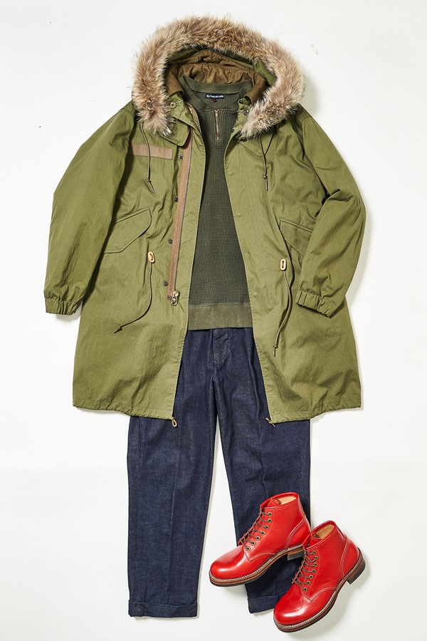 カラーブーツの代表格ともいうべき赤いブーツを履きこなすときは、トップスに赤の補色(反対色)であるグリーンのアイテムを取り入れると着こなしが決まりやすい。これは色相環(知らない人はググってね)に基づく配色で、赤なら緑、黄色なら青が反対色となるため、服だけに限らず様々なコーディネイトでも、活用したいテクニックだ。