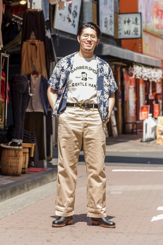 ワイドなチノパンに和柄のハワイアンシャツをさらりと羽織った男らしいコーディネイト。前を開けることでよりカジュアルに着こなせて、プリントTシャツもアクセントになっている。
