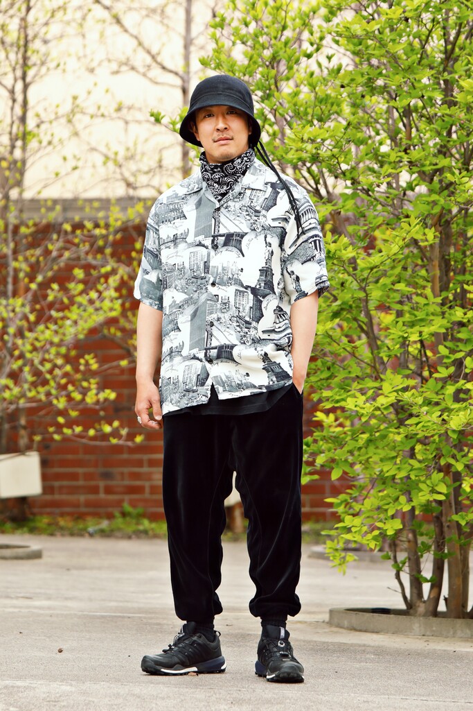 モノトーンのフォトプリントのハワイアンシャツに、あえてアウトドア向けのスニーカーやハットなどのスポーティーなアイテムを組み合わせたアイデアが光る。ブラックで統一することで、スポーツアイテムが浮くこともなく、うまい具合に調和されている。テーパードの強いリブパンツを選ぶあたりも今っぽい。