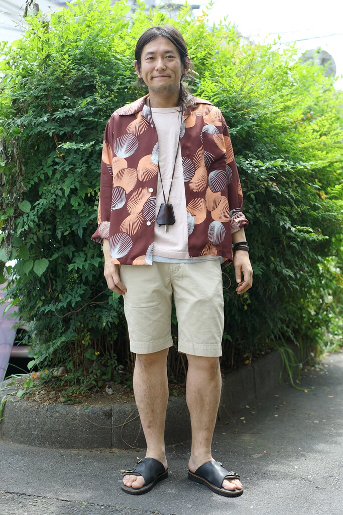 夏の定番、レーヨンハワイアンシャツの着こなしだが、落ち着きのあるカラーとロングスリーブは玄人好みのセレクト。シンプルなデザインの膝上丈チノショーツ、そして足元にはレザーサンダルで初夏にぴったりな上品な大人スタイルへと仕上がっている。
