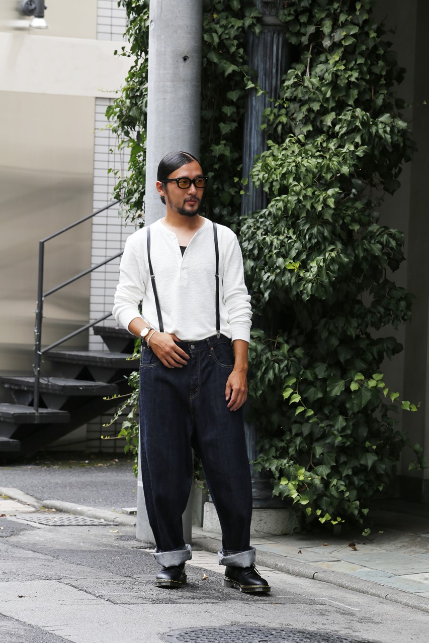バギーシルエットのデニムパンツをサスペンダーでクラシックに着こなしたスタイリング。それでオーセンティックすぎないのは、テーパードしたシルエットとロールアップの小技があってこそ。またデニムの他をブラックとホワイトでまとめたのも◎。