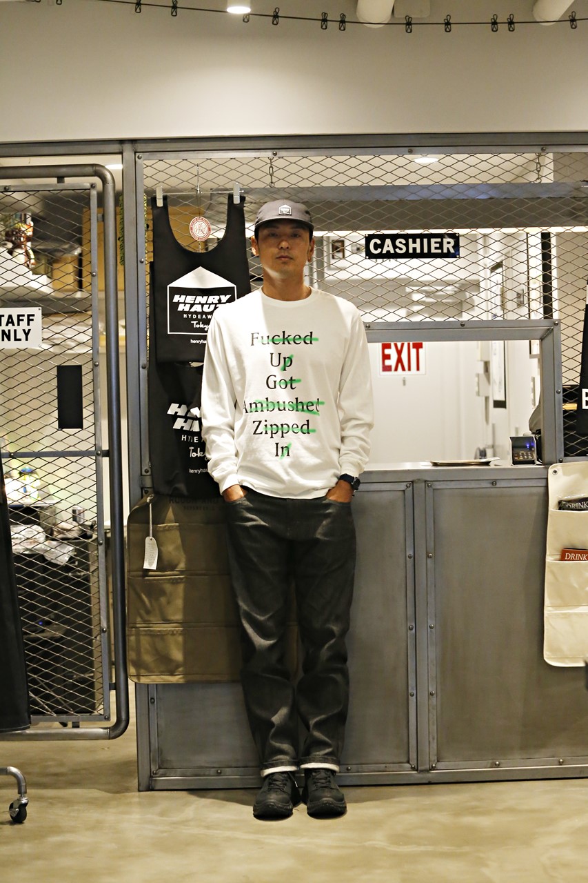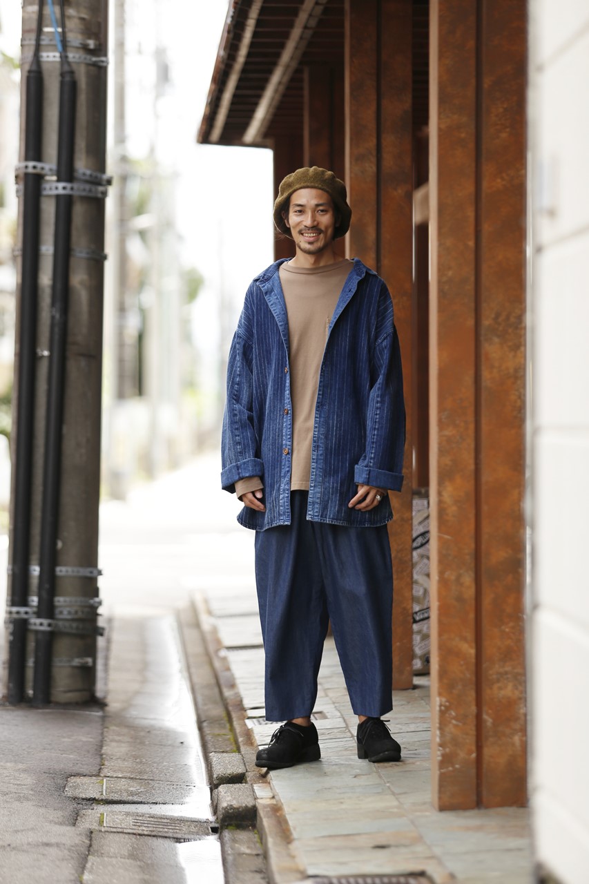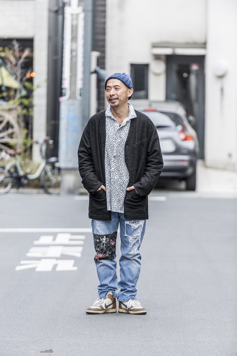 ユーズドのデニムにクラッシュ加工を施したスロウガンのデニムを着用した「スロウガン」デザイナー・小林学さん。膝に別生地でリメイクした小林さんだけのカスタムモデルとなる。トップにはフランスのヴィンテージをモチーフにしながらも、名作スニーカーのアスファルト柄を落とし込んだスロウガンの新作で、大人なストリートスタイルを演出。ザックリとした大きめのサイジングや足元のスニーカーも注目。