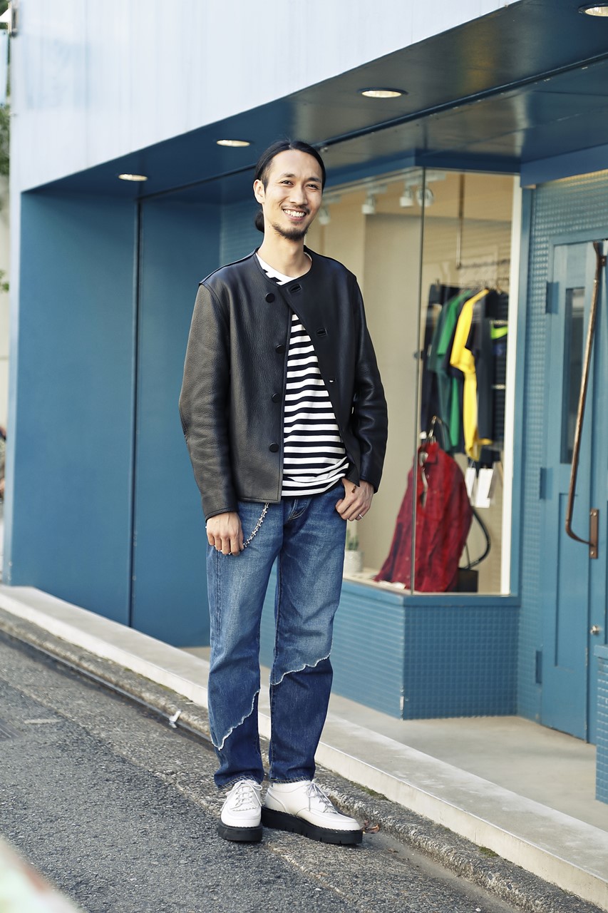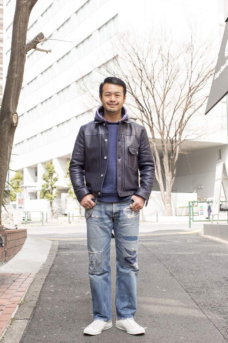 ベルベルジンのディレクターだけでなく、ヴィンテージデニムアドバイザーとしても活躍する藤原さん。ダメージデニムをリクエストしたところ、穿いてきてくれたのはリーバイス501E。ダメージデニムは一歩間違えるとルーズに見えるので、トップスのバランスが重要。この日は自身がファインダーズ キーパーズとコラボしたファーストタイプのレザージャケットで、大人っぽくコーデした。