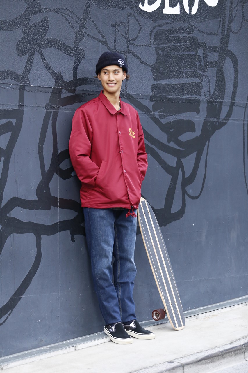 浅い色味のデニムとコーチジャケット、スニーカーという、西海岸のスケート&サーフカルチャーを感じるデウスらしいスタイル。流行にとらわれず自分が好きな着慣れたウエアを選んでいるような、力を入れすぎないスタイルが好印象。