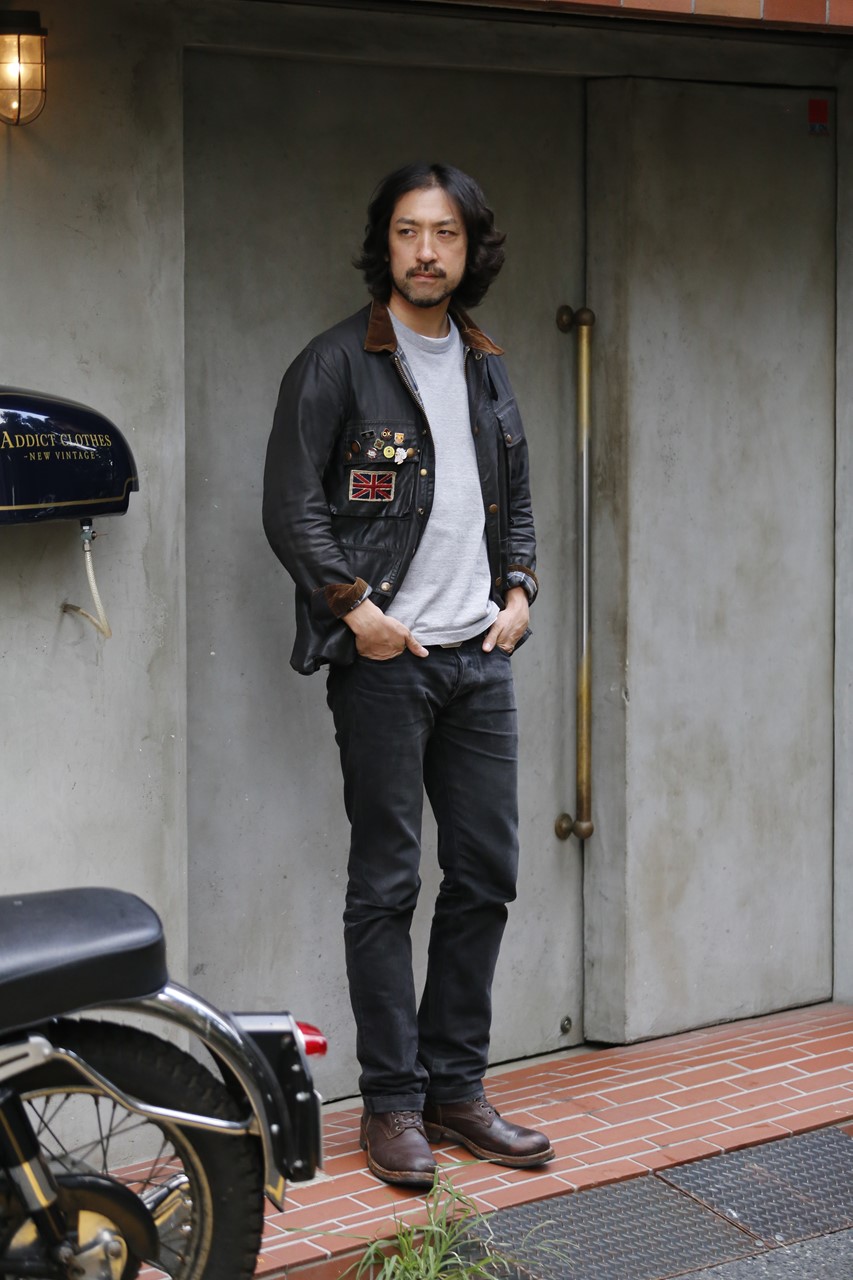 使い込まれた風合いのワックスドコットンジャケットを軸に、スリムシルエットのデニムパンツをコーディネイト。ブリティッシュモーターサイクルを彷彿させる着こなしはさすがの一言。ジャストサイズが重要とわかる、着こなしの好例を披露してくれた。