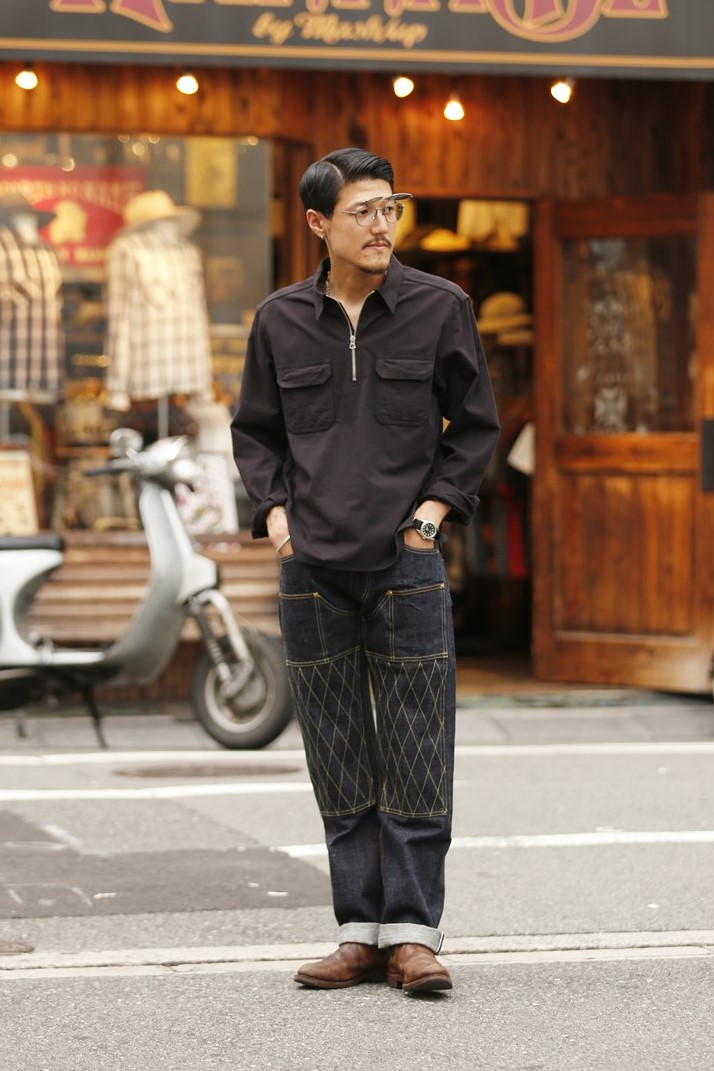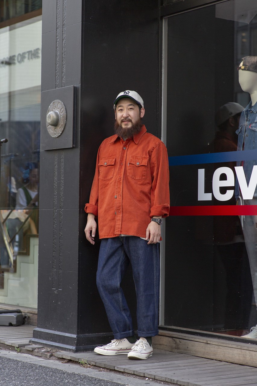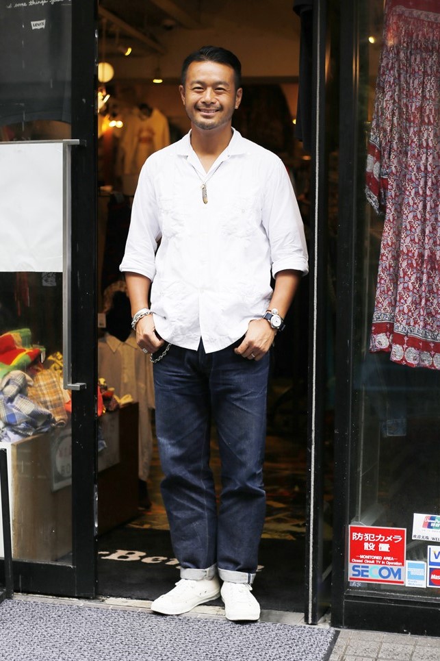 ヴィンテージ業界のアイコンのひとりである藤原さんのデニムスタイルをピックアップ。この日は爽やかなに66シングルと珍しい長袖のキューバシャツでコーディネート。足元はアーミーコンバースで爽やかに!